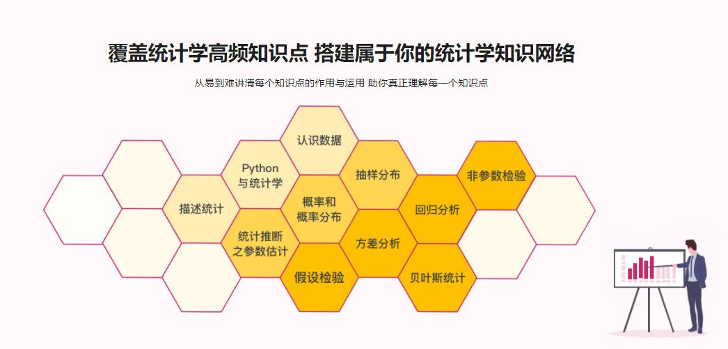 课程将统计学的内容讲的清晰完整,而且在各个章节中,加入了编程部分,更有助于程序员理解统计学。课程将深入浅出地讲解统计学的重要概念和知识点,让同学们彻底学会统计分析。是一门机器学习、数据分析师等前沿职位必须掌握的统计学课程。
