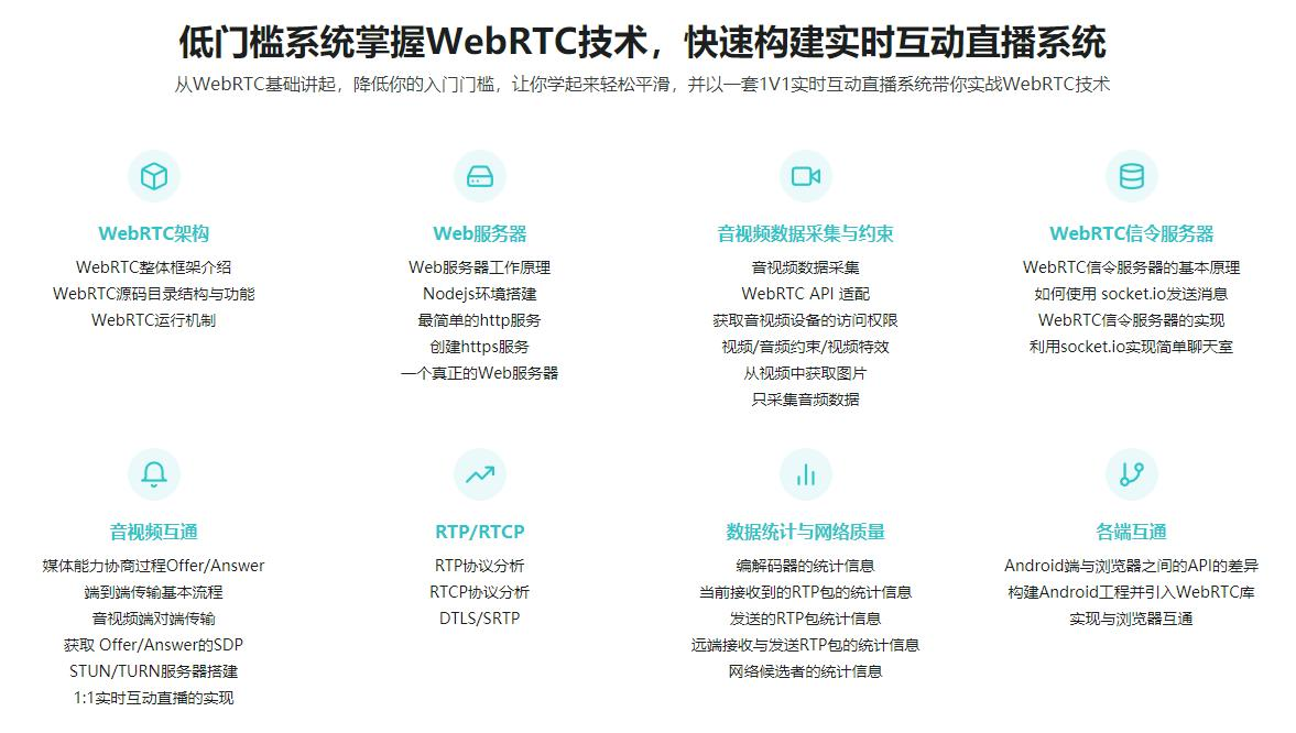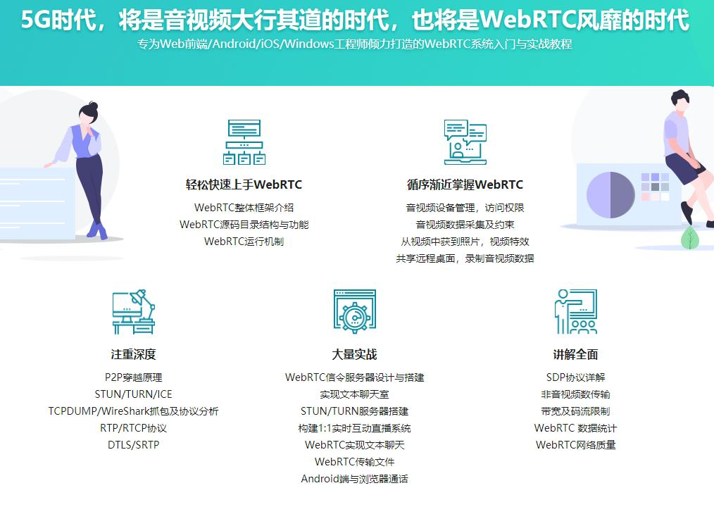 5G时代下,音视频行业将会得到前所未有的蓬勃发展,音视频人才将成为新的宠儿。本课程将从入门到实战,系统讲解WebRTC实时互动直播技术【音视频领域核心技术】,让你低门槛进入音视频行业,快速成为企业急需的音视频工程师。让你对整个 WebRTC技术的使用有非常深入的掌握,并有能力实现一套1对1音视频实时互动直播系统,并可以与其它终端进行互联。而这些能力正是当下企业急需的能力。还在等什么,赶快学起来!