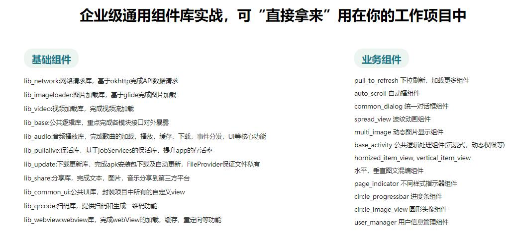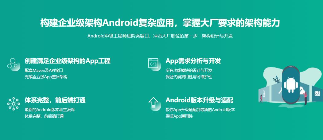 课程以企业级Android App的架构设计与功能开发,带你初探Android组件化架构、实战各类通用组件,学会构建高扩展性、高可靠性、高可维护性的Android工程,掌握一线互联网公司的工程架构与管理方式。