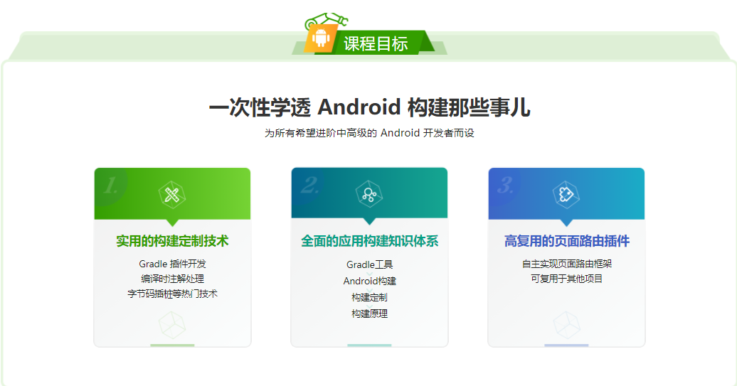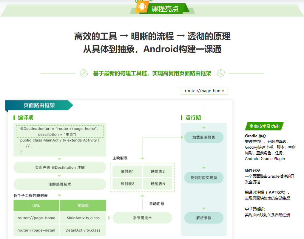 本课程基于最新构建工具链,以一个页面路由框架的开发-发布为主线,将实战与理论相结合,深度学习 Gradle 及时下热门的编译时注解处理、字节码插桩等高级技术,带领大家系统化掌握 Android 应用构建知识,提升开发效率。