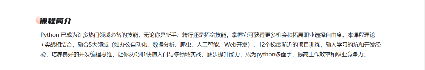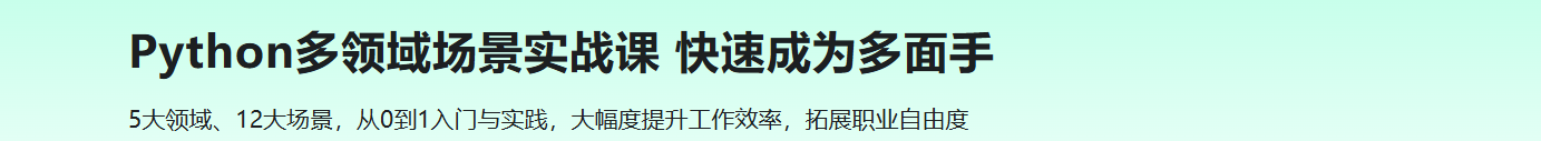 Python 已成为许多热门领域必备的技能,无论你是新手、转行还是拓宽技能,掌握它可获得更多机会和拓展职业选择自由度。本课程理论+实战相结合,融合5大领域(如办公自动化、数据分析、爬虫、人工智能、Web开发),12个梯度渐近的项目训练,融入学习的坑和开发经验,培养良好的开发编程思维,让你从0到1快速入门与多领域实战,逐步提升能力,成为python多面手,提高工作效率和职业竞争力。
