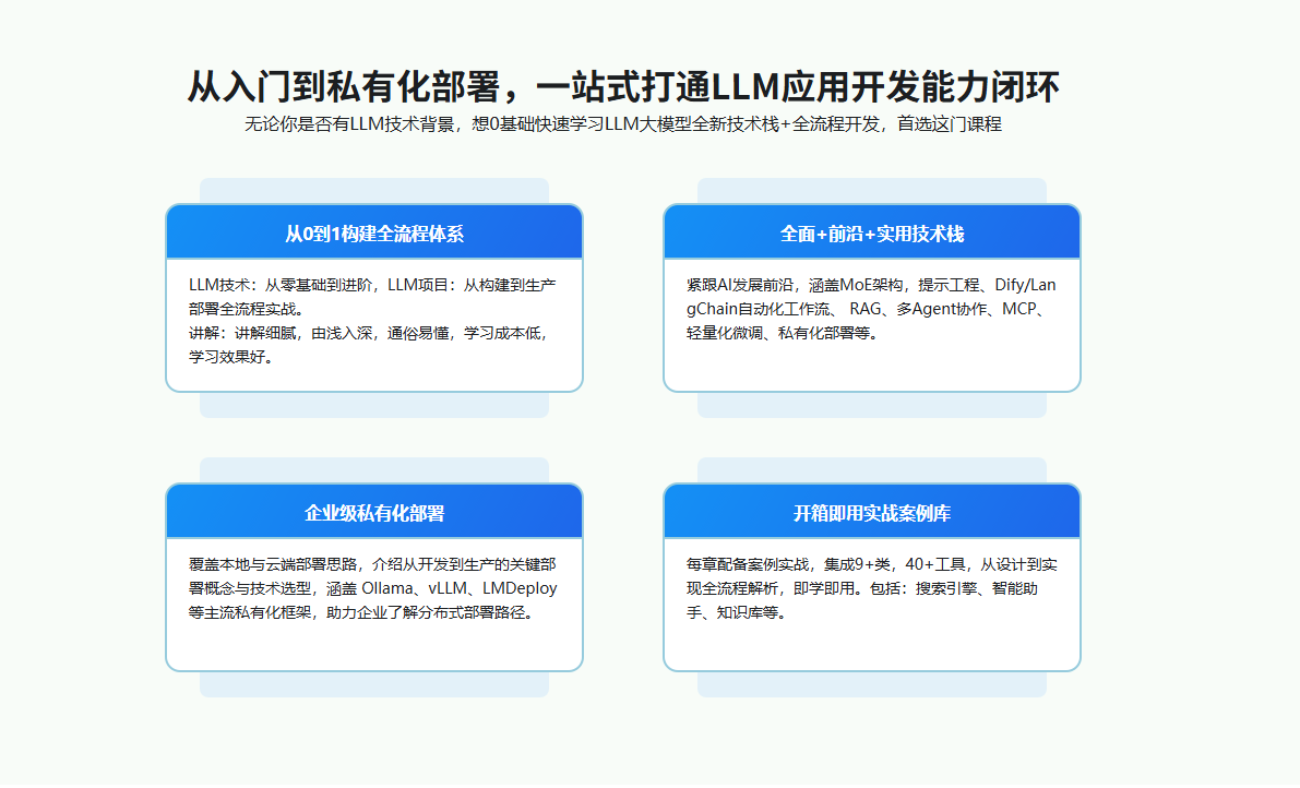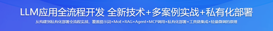 本课汇聚一线AI架构师与工程专家智慧,聚焦企业LLM应用开发、私有化部署及性能优化痛点。带你从LLM零基础开始,讲解MoE架构,实践Ollama/vLLM等私有化部署方案,精通企业级提示工程、Dify/LangChain自动化工作流、RAG、MCP调用、轻量化微调及多Agent协作等技术。通过从0到1构建AI编程助手、智能客服等全流程项目实战,具备大模型和业务需求整合能力,一站式打通LLM应用开发能力闭环