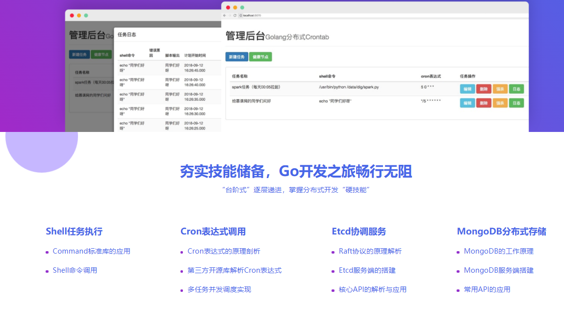 golang因其强大的协程机制,广泛应用于解决分布式环境下的高并发问题。本课程结合Etcd与MongoDB实现一个基于Master-Worker分布式架构的任务调度系统,带你掌握Golang的工程实践能力以及CAP、Raft等知识经验。
