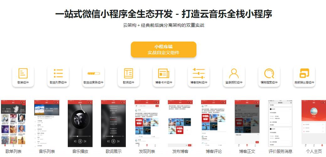 课程以小程序最新技术+云开发模式,打造一个云音乐全栈小程序,以各种自定义组件开发小程序前端部分,小程序云开发小程序后端部分,配套后台管理系统连接小程序云数据库及云存储,实现项目数据管理。吃透小程序开发所有技术点,一个人也能实现全栈开发。