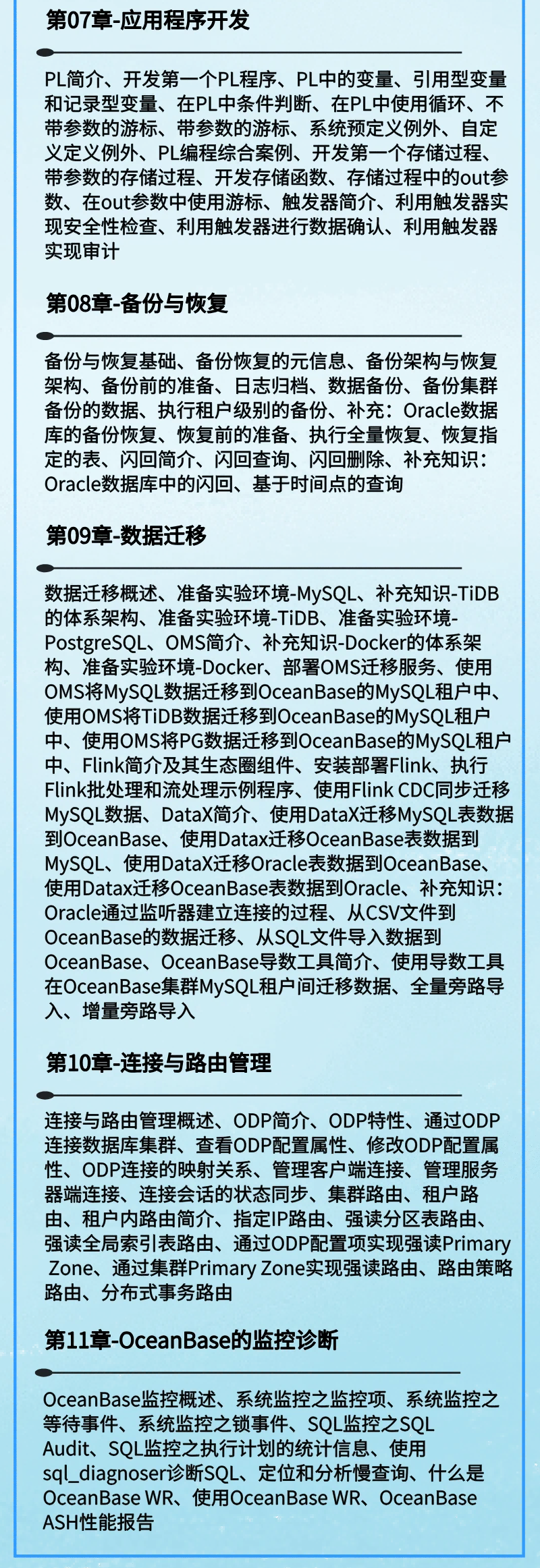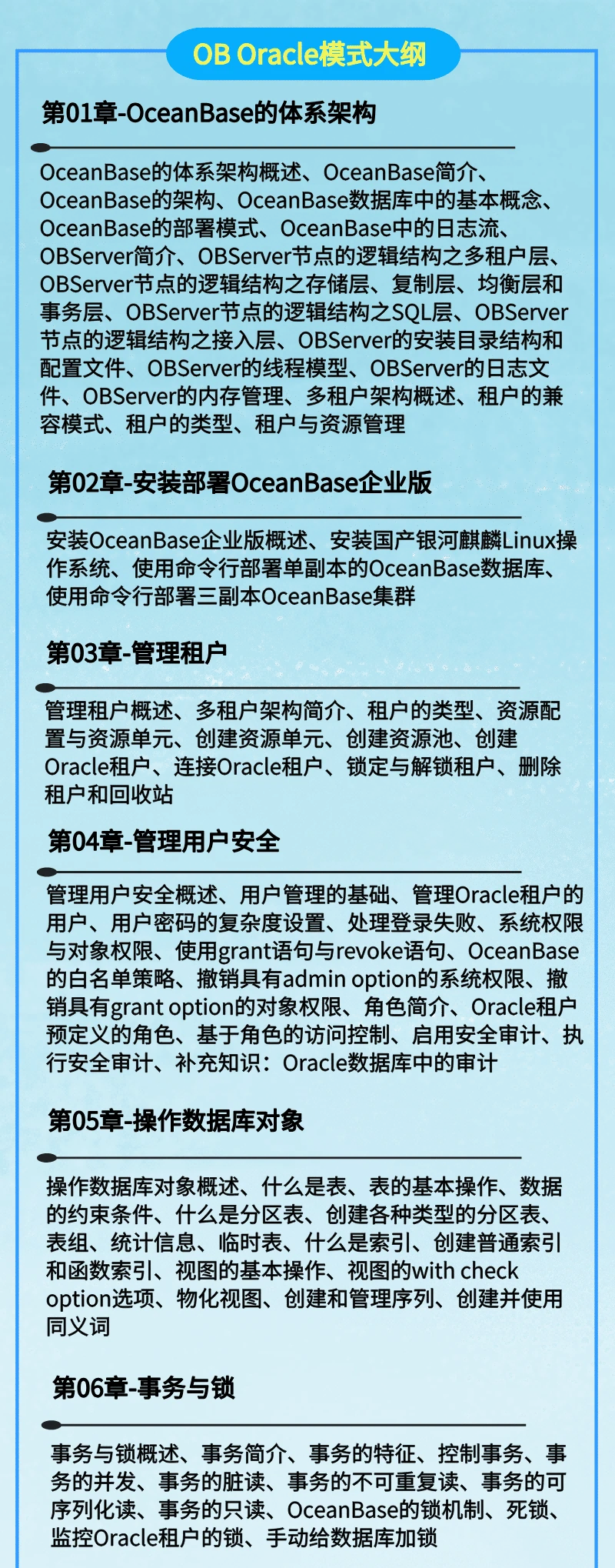 本课程对数据库的研发人员、数据库构师、数据库运维人员而设置,将重点覆盖OceanBase数据库。具体内容包括:数据库的体系架构与安装配置、数据库的用户管理、数据库的并发与锁、备份与恢复技术、数据库的监控优化等知识。通过课程学习让学员全面系统的掌握OceanBase。