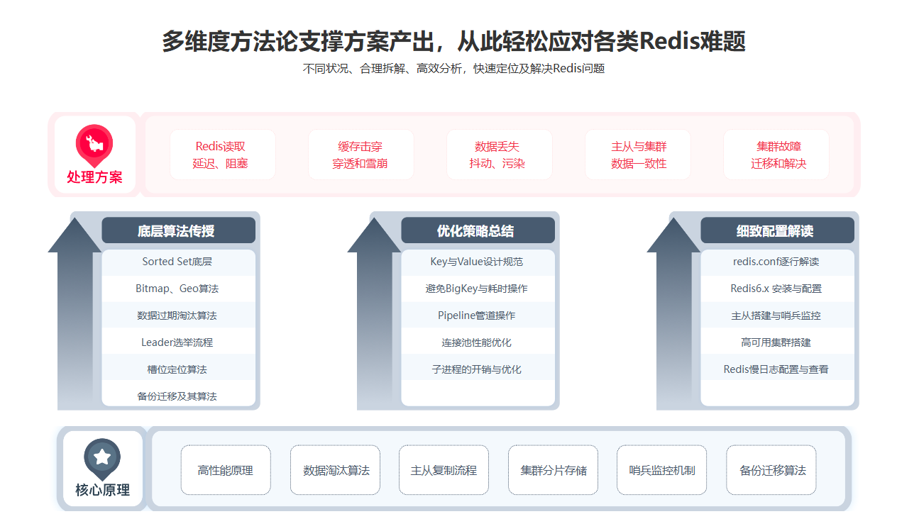本课程以一个实战项目为主线,整合Redis各种问题场景,不断改造项目,以问带学。学完本课后,面对Redis相关问题,你将能够快速进行排查与修复,无论实际工作还是跳槽面试你都将游刃有余。