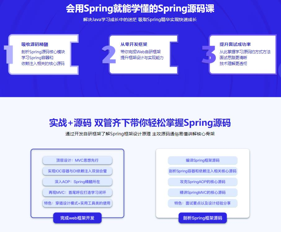 课程在自研框架和Spring框架的穿插讲解中让大家逐渐熟悉Spring框架的脉络。通过从0搭建一个较为完备的Web框架来提升框架设计能力,辅以通俗易懂的Spring核心模块源码的讲解,带你了解Spring框架的设计思路。
