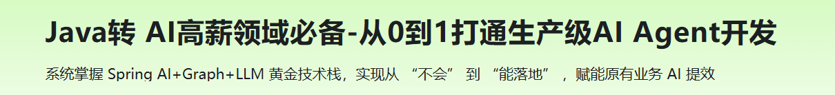 本课程通过手把手教学 “ Agent库存调拨优化系统”与“Agent BI 报表问答系统”两大智能体,帮你系统掌握Spring AI、Graph、LLM 等技术,并驾驭开发智能体全流程。同时学会将 AI 赋能原有系统业务,实现原有业务降本提效。最终实现不切换技术栈,低成本转入火爆的AI应用开发领域,快速构建 AI 时代的技术护城河,实现职业高薪突破。