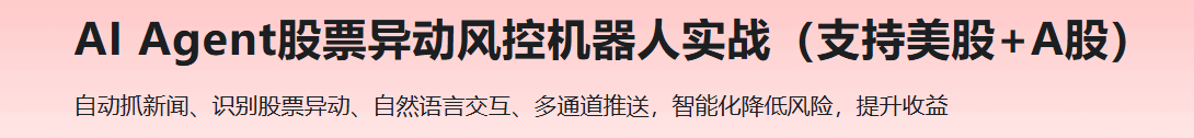 你是否因为信息滞后、缺乏实时风控而错过卖点、整夜盯盘? 2026 AI Agent大爆发,已强大到可替我们7×24 小时降低股票风险,异常信号一旦出现,机器人将发出预警。为此,慕课网重磅推出《AI Agent股票异动风控机器人》实战课程,从0到1构建一个能自动抓取新闻、识别股票异动、自然语言交互、多通道秒级推送的AI Agent,替你盯盘、替你风控!项目可上架,也可封装成 SaaS 接私单。先人一步,抓住红利窗口期。