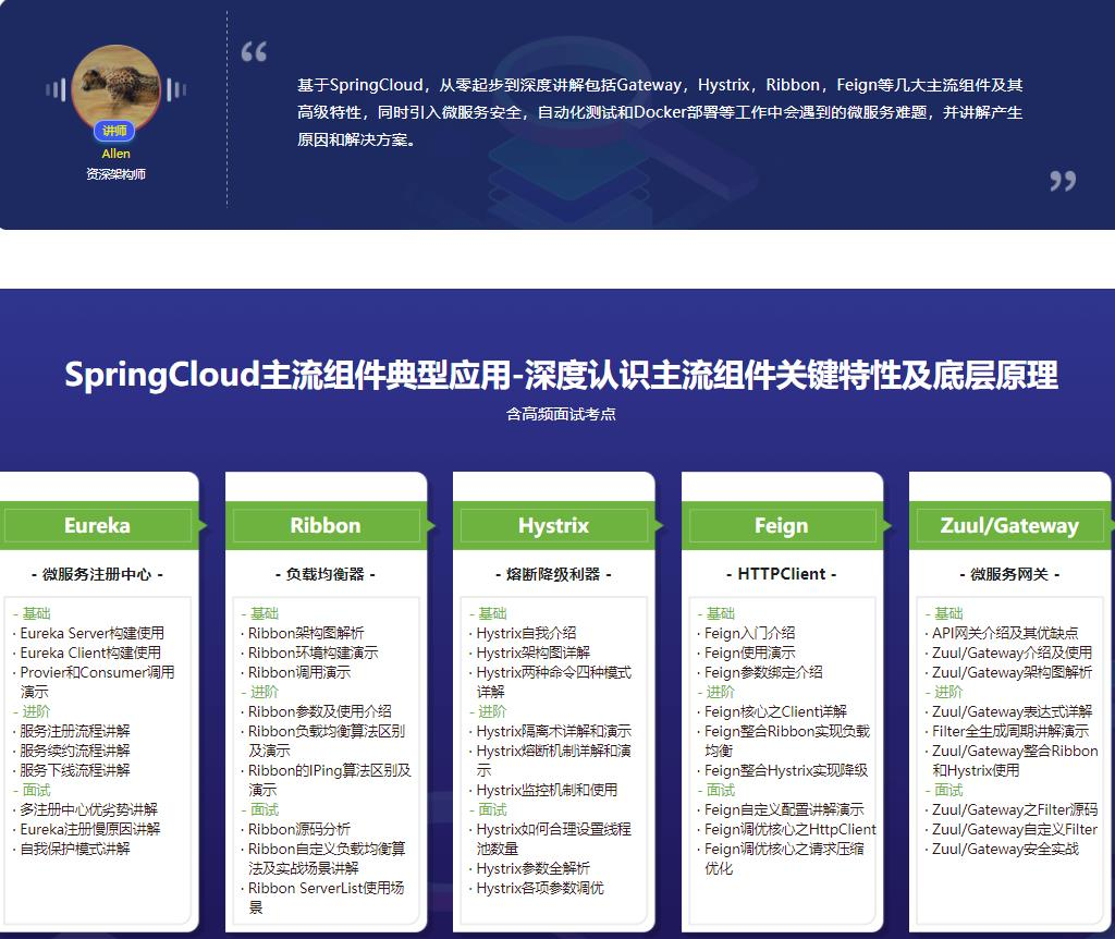基于SpringCloud,从零起步到深度讲解包括Gateway,Hystrix,Ribbon,Feign等几大主流组件及其高级特性,同时引入微服务安全,自动化测试和Docker部署等工作中会遇到的微服务难题,并讲解产生原因和解决方案。