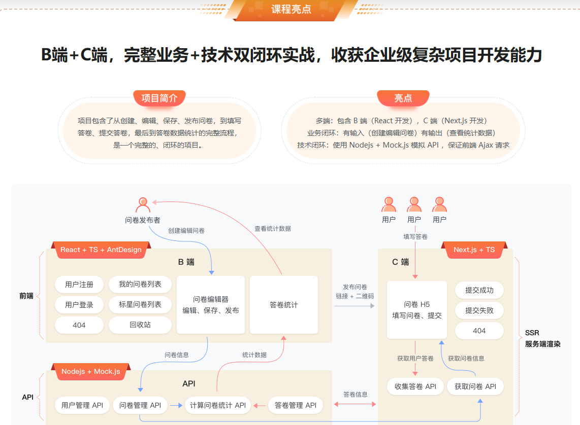 问卷编辑发布完以后,会产出一个 H5 页面,供用户填写提交答卷,即 C 端。本章使用 Next.js 开发 C 端 H5 页面,让你从 0 学会 React 技术栈的 SSR 服务端渲染。本章内容和 B 端的发布、统计有很强的关联,体现系统的统一完整性。收起列表