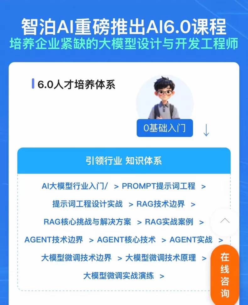 【2026年最新】智泊AGI大模型应用开发实践班 V6.0升级版 ✅ 10大商业项目实战,100+企业级案例,课程内容全面,持续更新 ✅ 覆盖大模型基础、RAG、Agent智能体、LLM微调、DeepSeek私有化部署、RAG知识库、Agent开发、DeepResearch、Agent Copilot、企业级HR智能体平台等全流程内容 ✅ 资深AI团队授课,内容贴合行业趋势,适合产品、开发、测试、数据分析等人群,零基础可学,实战产出作品
