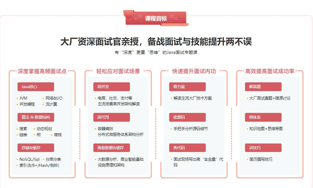你是否正打算跳槽找工作? 希望拿到高薪? 获得心仪的Offer?那么,这门课将是你得不二之选!课程中,前阿里P8【求老仙】将结合多年面试官经验,深度剖析Java核心技能,多角度解读经典大厂面试真题,更有内功专项提升指导,改善面试思维,让你秒变offer收割机!