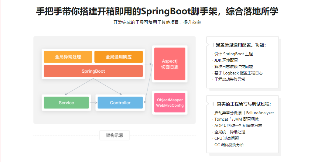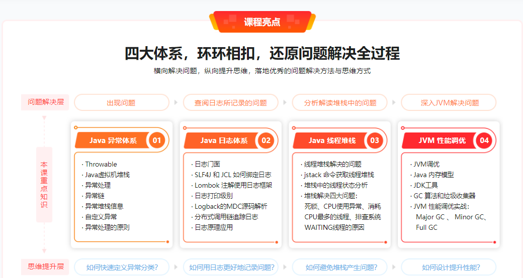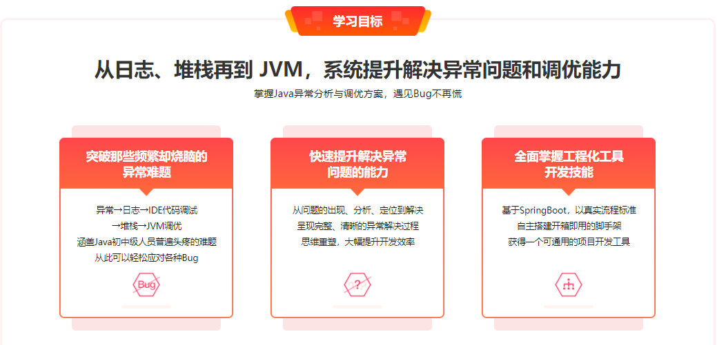 项目异常不断,找不到问题所在?百度、Google搜个遍,也找不到答案?本课程针对Java开发中常见的各种异常,从日志、堆栈再深入到JVM,带你发现问题、定位问题、解决问题,最后在实战中搭建开箱即用的SpringBoot脚手架,强化巩固所学,助力你提升开发技能!