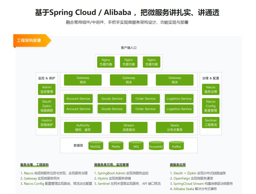 这一章我将会梳理课程的所有知识点,对 SpringCloud 和 SpringCloud Alibaba 做总结说明。同时,再去铺开微服务工程的几类问题,并说明这些问题的解决方案、解决思想。