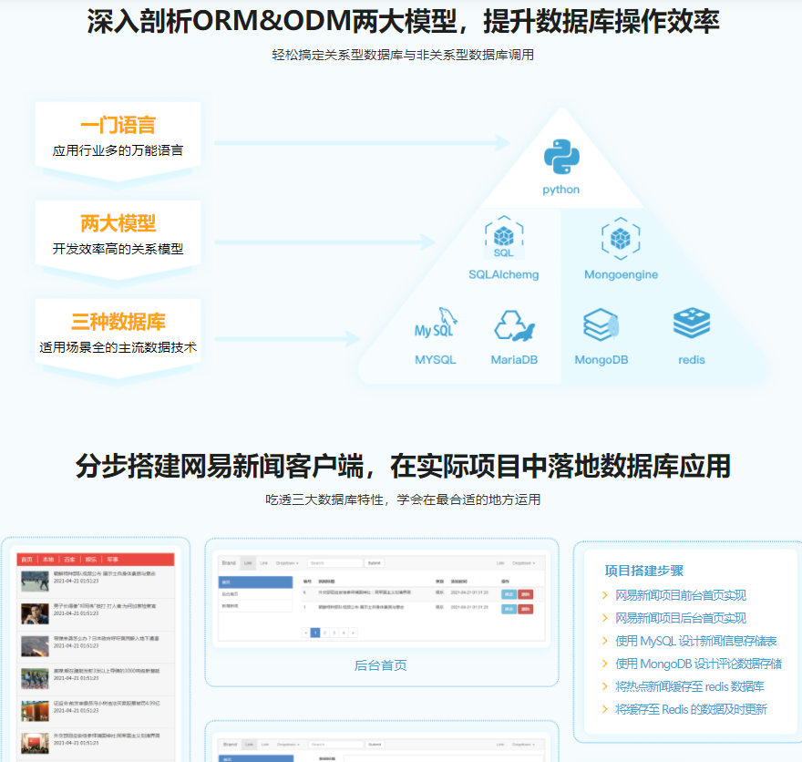 在开发中不可避免和数据库打交道,本课程专为只懂Python语法的同学准备,在逐步讲解MySQL、MongoDB、Redis 三大主流数据库基础知识的同时,带你用Python 操作三种数据库搭建一个简易的网易新闻移动端前后台,在实操实练中掌握不同类型数据库的特性,落地不同场景下数据库技术的应用。