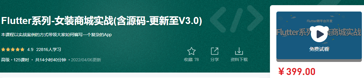 Flutter系列-女装商城实战(含源码-更新至V3.0) 百度网盘下载 本课程以实战案例的方式带领大家如何编写一个复杂的App