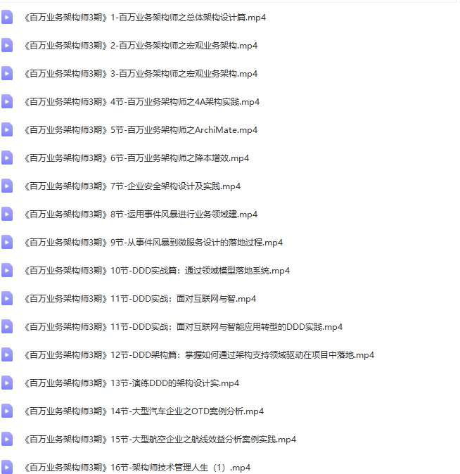 ├──《百万业务架构师3期》22节-百万业务架构师工作坊实战(业务架构).mp4 1.04G