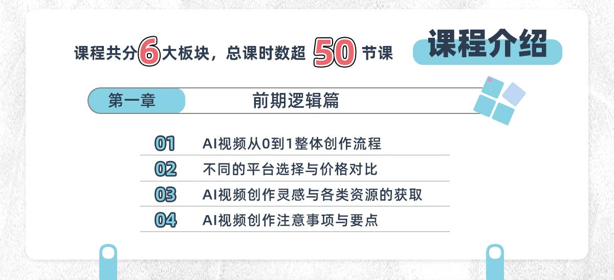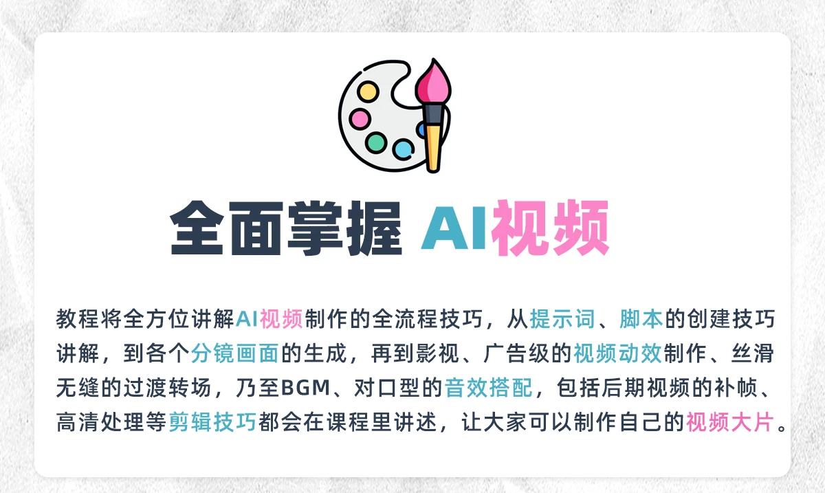 教程将全方位讲解 AI 视频制作的全流程技巧,从提示词、脚本的创建技巧讲解,到各个分镜画面的生成,再到影视、广告级的视频动效制作、丝滑无缝的过渡转场,乃至 BGM、对口型的音效搭配,包括后期视频的补帧、高清处理等剪辑技巧都会在课程里讲述,让大家可以制作自己的视频大片。