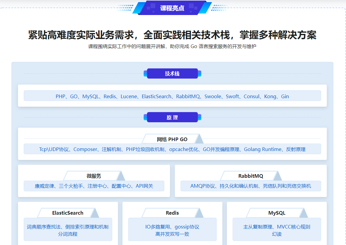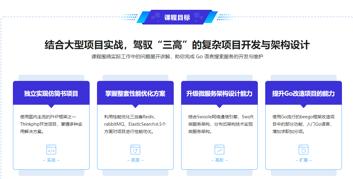 PHP程序员唯有掌握更高级的技能和架构设计思维,才能发展的更好。让自己成为不可替代的人员,需要全面提升掌控大中型项目能力、架构设计思维能力、独立完成复杂项目能力。本课程通过复杂大型项目实战,系统讲解各技术实现的底层原理和算法,带你掌握性能调优以及高可用、高并发微服务架构,并上手Go语言框架,进一步提升自己的技术储备,为你求职和涨薪增加筹码!