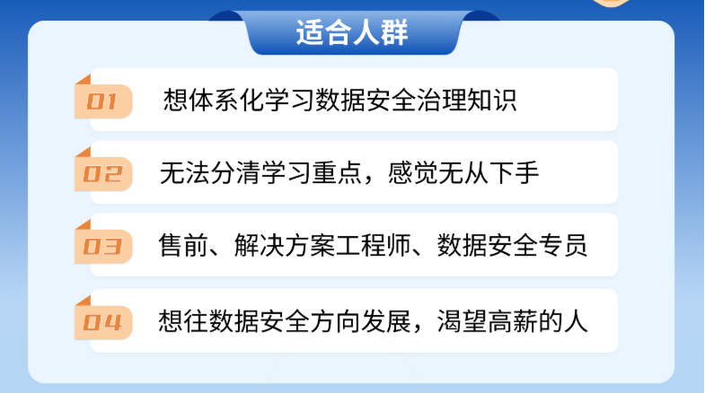 1、想体系化学习数据安全治理知识; 2、学习无法分清重点,感觉无从下手; 3、售前工程师、解决方案工程师等; 4、想往数据安全方向发展,渴望高薪的人。
