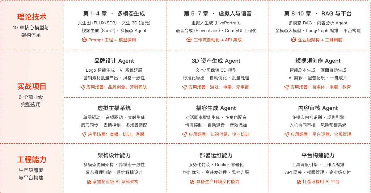 10 章核心技术 × 6 个商业项目 × 4 大能力进阶 = 一站式企业级多模态创作系统