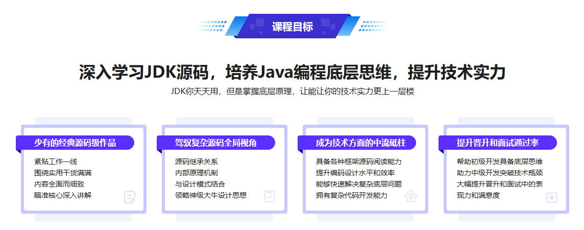 JDK是Java开发工具包,包含了编译、运行、调试等关键命令。其核心是Java API的预定义的类库,这些对开发人员说是必备技能。课程内容全面,知识覆盖面超全,结合实际案例手把手式教学,助你系统性掌握JDK底层源码,大牛设计思想,在工作中游刃有余。