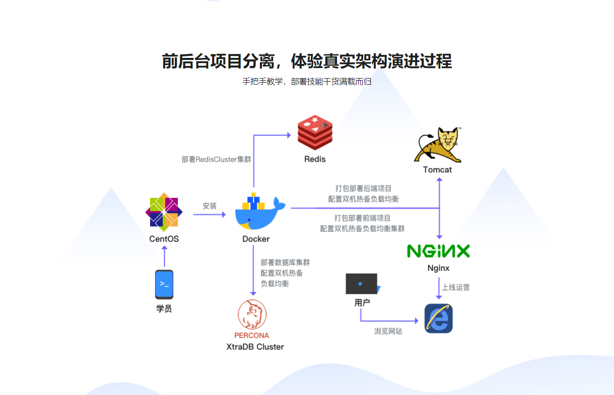 本课程把一个真实企业级前后端分离项目部署在Linux环境中,利用Docker虚拟机的容器技术,采用分布式集群部署,将项目转换成为高性能、高负载、高可用的部署方案。包括Docker集群、MySQL集群、Redis集群、负载均衡、双机热备等等。
