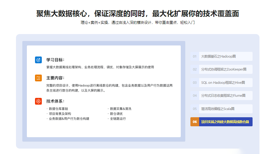大数据在互联网与工业领域的价值不用赘言,随着人工智能、区块链等技术越来越火热,许多企业也加入了大数据的“抢人大战”。大数据技术栈众多,学习曲线陡峭,为了更好地帮你入门,我们将从大数据基石——Hadoop讲起,过渡到Hive,一步步掌握数仓、数据处理、离线开发等关键技能点,并最终通过一个大型项目的实战,带你进入大数据的世界!数千小时授课时长,众多学员口碑选择