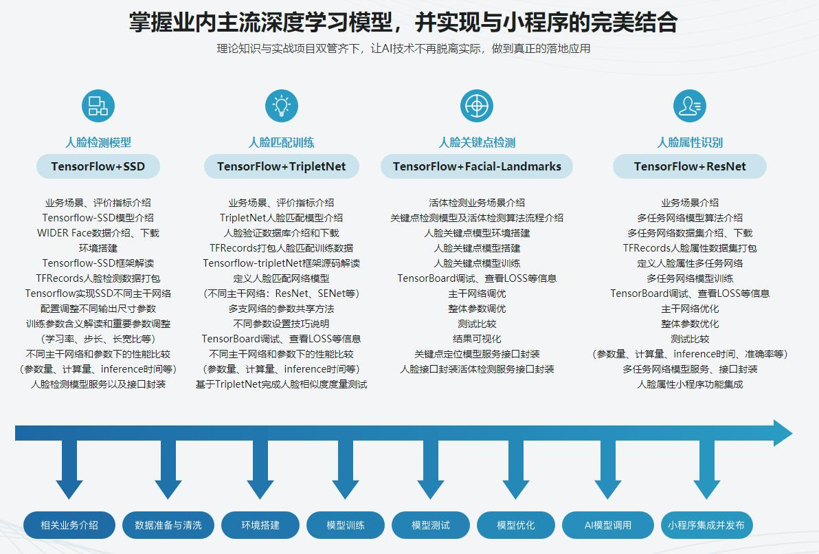 伴随着人工智能技术的发展,深度学习技术变得越来越热门,越来越多的人选择转行做深度学习算法工程师。本课程围绕人脸相关技术,展开多个模型的教学,涉及人脸检测、人脸匹配、人脸关键点定位等基础研究技术,最终搭建一个人脸智能小程序,完成整个项目的实战应用,最终可以达到算法工程师的初步要求。