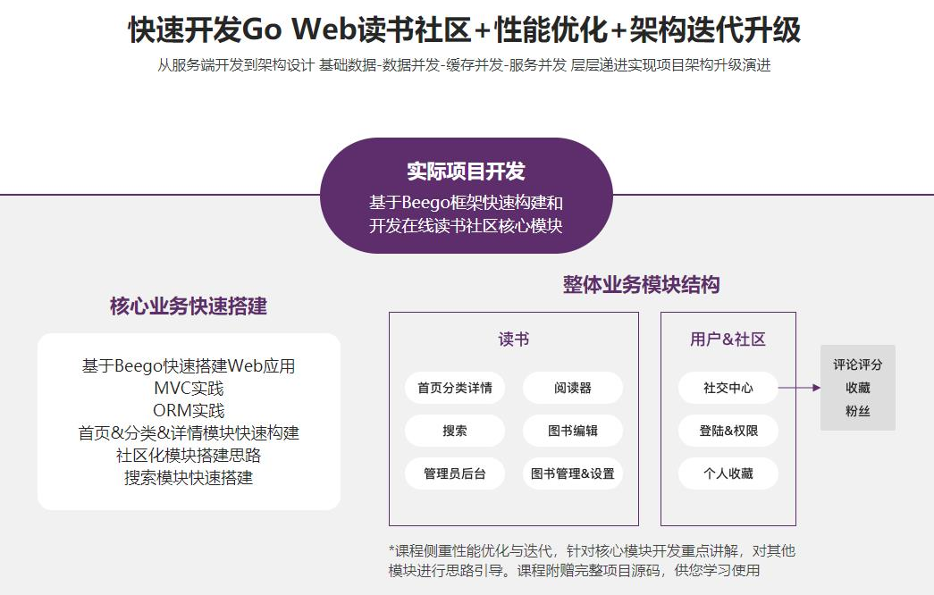 课程先使用Go语言及Beego框架进行项目开发,快速迭代上线,然后进行包括主从和分表分库、搜索优化、页面静态化、动态缓存、下载优化、服务负载均衡等一系列架构优化,最后实现Web应用的高可用&高并发。
