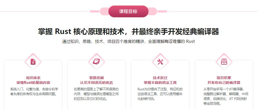 Rust是一门很有前途的明星语言,但同时又以高难度、高门槛而著称,劝退了不少自学者和有需求的开发人员。本课程将带你从基础入手,通过平缓的学习曲线和丰富的案例,并以编译器作为实战项目,让你熟练掌握 Rust 的应用,并有能力解决实际开发中的各种复杂问题。
