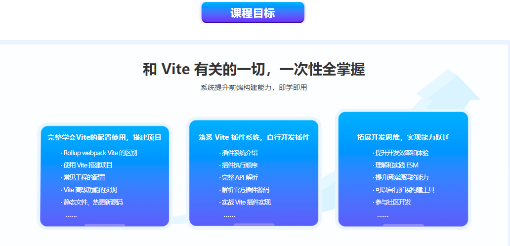 Vite 因为其跨前端框架的能力和极其优越的性能,被称为下一代前端构建工具。如果你想在未来几年有更好的发展空间,那么最好尽早学会 Vite。 我们将从如何配置使用入手,深入到Vite的场景、插件以及源码,帮助大家系统掌握 Vite,全面提升对前端构建的认知,更能自行构建项目,为进阶前端架构师打下坚实的基础。
