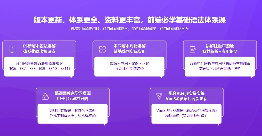JS是前端立身之本,不管框架多花哨,不会JS也是白扯。这门课可以帮助你夯实前端基础,掌握最新的ES6到11语法,稳步提升编程能力。课程带你熟练掌握语法,很多依赖第三方库才能做到的事用原生JS寥寥几行代码就可迎刃而解。