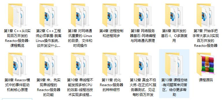 ├──第1章 C++从0实现百万并发的Reactor服务器-课程概览 | ├──1-1 C++从0实现百万并发的Reactor服务器-课程概览.mp4 38.19M ├──第2章 C++工程师必须掌握-脱离Linux操作系统,谈并发没什么意义 | ├──2-1 Linux环境高级编程导学.mp4 13.91M | ├──2-2 Linux的Hello world.mp4 61.41M | ├──2-3 VSCode的安装和配置.mp4 77.19M | ├──2-4 静态库和动态库.mp4 63.28M | ├──2-5 编译规则文件makefile.mp4 86.86M | ├──2-6 main函数的参数.mp4 41.68M | ├──2-7 gdb常用命令.mp4 52.43M | ├──2-8 gdb调试core文件.mp4 33.38M | ├──2-9 gdb调试正在运行中的程序.mp4 26.22M ├──第3章 对网络通讯重要的-Linux的目录、文件和时间操作 | ├──3-1 Linux的时间操作.mp4 44.06M | ├──3-2 Linux的目录操作.mp4 34.88M | ├──3-3 Linux的系统错误.mp4 61.15M | ├──3-4 目录和文件的更多操作.mp4 42.81M ├──第4章 进程控制和进程同步 | ├──4-1 Linux的信号.mp4 107.41M | ├──4-10 多进程的生产消费者模型.mp4 24.16M | ├──4-11 pthread线程库.mp4 24.38M | ├──4-12 UNIX环境高级编程.mp4 17.90M | ├──4-2 进程终止.mp4 48.02M | ├──4-3 调用可执行程序.mp4 64.03M | ├──4-4 创建进程.mp4 99.19M | ├──4-5 僵尸进程.mp4 70.76M | ├──4-6 多进程与信号.mp4 39.62M | ├──4-7 共享内存.mp4 48.85M | ├──4-8 循环队列.mp4 102.21M | ├──4-9 信号量.mp4 92.23M ├──第5章 网络服务器基石-网络编程与网络通讯原理 | ├──5-1 网络编程基础导学.mp4 4.63M | ├──5-10 多进程的服务端.mp4 78.87M | ├──5-11 三次握手与四次挥手.mp4 110.97M | ├──5-12 TCP缓存.mp4 51.40M | ├──5-2 .第一个网络通讯程序.mp4 85.80M | ├──5-3 基于Linux的文件操作.mp4 77.47M | ├──5-4 socket函数详解.mp4 59.40M | ├──5-5 主机字节序与网络字节序.mp4 28.35M | ├──5-6 万恶的结构体.mp4 94.78M | ├──5-7 封装socket客户端.mp4 103.30M | ├──5-8 封装socket服务端.mp4 48.64M | ├──5-9 实现文件传输功能.mp4 111.74M ├──第6章 高并发的基石-I、O多路复用 | ├──6-1 IO多路复用-select模型(上).mp4 116.87M | ├──6-2 IO多路复用-select模型(下).mp4 65.06M | ├──6-3 IO多路复用-poll模型.mp4 48.93M | ├──6-4 IO多路复用-epoll模型.mp4 72.18M | ├──6-5 阻塞&非阻塞的IO.mp4 84.42M | ├──6-6 水平触和&边缘触发.mp4 127.55M | ├──6-7 epoll的原理.mp4 11.84M ├──第7章 开始手把手带大家从0实现百万并发的Reactor服务器 | ├──7-1 从0实现百万并发的Reactor服务器导学.mp4 16.25M | ├──7-2 优化epoll服务端程序,为封装做准备.mp4 75.30M | ├──7-3 优化epoll服务端程序,为封装做准备.mp4 33.63M | ├──7-4 把网络地址协议封装成InetAddress类.mp4 76.00M | ├──7-5 把socket的库函数封装成Socket类.mp4 104.83M | ├──7-6 把epoll的各种操作封装成Epoll类.mp4 75.45M | ├──7-7 把与TCP连接通道封装成Channel类(上).mp4 62.66M | ├──7-8 把与TCP连接通道封装成Channel类(中).mp4 160.37M | ├──7-9 把与TCP连接通道封装成Channel类(下).mp4 50.80M ├──第8章 Reacor模式中的事件驱动机制核心原理 | ├──8-1 用C++11的function实现函数回调.mp4 63.71M | ├──8-2 把事件循环封装成EventLoop类.mp4 38.35M | ├──8-3 把服务端封装成TcpServer类.mp4 49.13M | ├──8-4 把接受客户端连接封装成Acceptor类.mp4 69.05M | ├──8-5 把TCP连接封装成Connection类.mp4 41.00M | ├──8-6 在Channel类中回调Acceptor类的成员函数.mp4 43.51M | └──8-7 在Acceptor类中回调TcpServer类的成员函数.mp4 47.30M ├──第9章 来,先实现单线程的Reactor服务器的功能 | ├──9-1 用map容器管理Connection对象.mp4 51.06M | ├──9-2 在Channel类中回调Connection类的成员函数.mp4 50.55M | ├──9-3 在Connection类中回调TcpServer类的成员函数.mp4 47.59M | ├──9-4 网络编程为什么需要缓冲区Buffer?.mp4 67.39M | ├──9-5 封装缓冲区Buffer类.mp4 91.45M | ├──9-6 使用接收缓冲区inputbuffer.mp4 107.79M | ├──9-7 使用发送缓冲区outputbuffer.mp4 94.76M | ├──9-8 优化回调函数.mp4 76.74M | ├──9-9 实现回显服务器EchoServer.mp4 107.71M ├──第10章 单线程不能发挥多核CPU的效率-线程池技术实现多线程的Reactor服务器 | ├──10-1 简单优化Buffer.mp4 31.92M | ├──10-2 封装线程池ThreadPool类.mp4 71.11M | ├──10-3 多线程的主从Reactor模型.mp4 120.90M | ├──10-4 增加工作线程.mp4 85.81M ├──第11章 优化Reactor服务器的种种细节 | ├──11-1 在多线程中如何管理资源?.mp4 61.01M | ├──11-2 用shared_ptr管理共享资源.mp4 121.38M | ├──11-3 用unique_ptr管理自己的资源.mp4 152.54M | ├──11-4 用eventfd实现事件通知.mp4 93.74M | ├──11-5 异步唤醒事件循环(上).mp4 82.83M | ├──11-6 异步唤醒事件循环(下).mp4 126.07M | ├──11-7 性能优化-阻止浪费,清除空闲的TCP连接(上).mp4 92.93M | ├──11-8 性能优化-阻止浪费,清除空闲的TCP连接(中).mp4 83.11M | ├──11-9 性能优化-阻止浪费,清除空闲的TCP连接(下).mp4 163.11M ├──第12章 真金不怕火炼-在正式PC服务器测试,见证每秒百万并发 | ├──12-1 如何让多线程的网络服务程序体面的退出.mp4 111.93M | ├──12-2 如何设计更高效的Buffer.mp4 93.70M | ├──12-3 性能测试-100万秒的吞吐量.mp4 87.78M | ├──12-4 如何基于Reactor服务器开发业务.mp4 149.06M ├──第13章 课程总结-有问题常来问答区,给你更多帮助 | ├──13-1 课程复盘.mp4 21.71M └──课程源