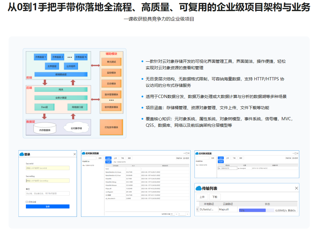 会Qt薪资更高,学Qt找对课程,跟对老师也不难。慕课网首门Qt系统精讲与企业级项目实战课,将从0到1为你系统构建Qt知识体系,全流程实战企业级项目“云对象存储浏览器”,让你高效吸收大牛多年实战经验,少走弯路,快速迈进职业发展快车道,拓宽职业宽度,提升职业高度。