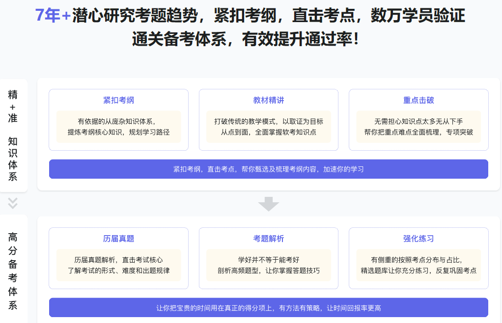 根据学习二八定律的原则,再次把一些重要的知识进行归纳总结浓缩精炼,让学员快速回顾重点知识从而提升学习效率。考前冲刺是在前面基础章节内容及真题内容都学习完成后,然后有侧重点的复习一些必须掌握的知识和题型,学员在即将步入考场之际必须确保这些知识的掌握。…