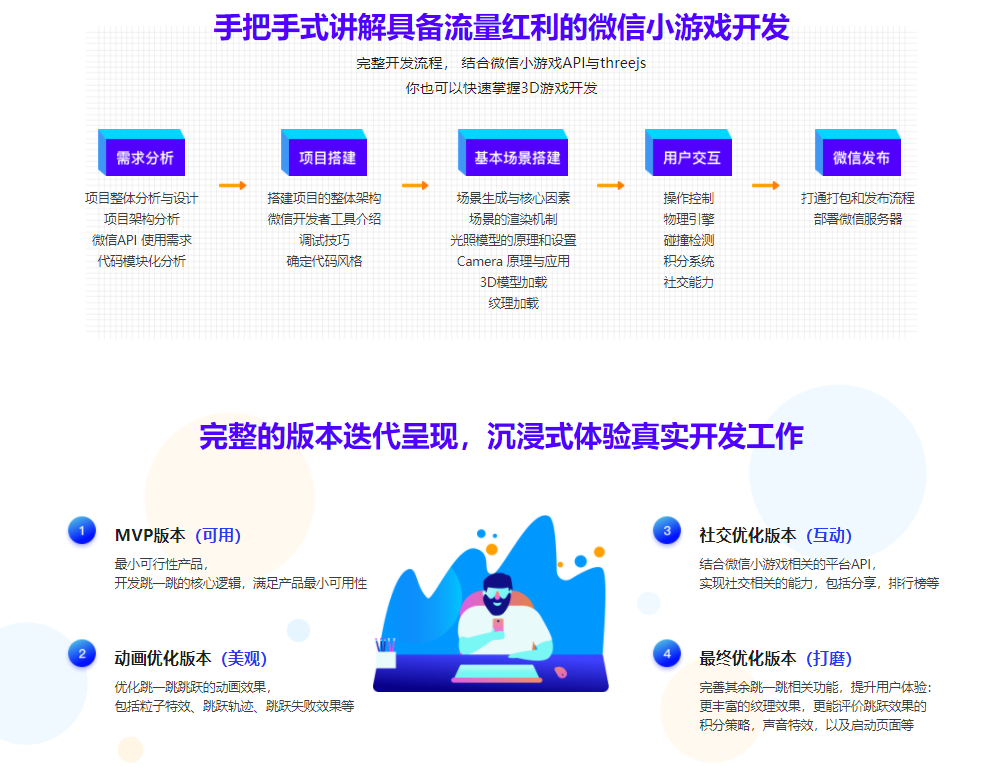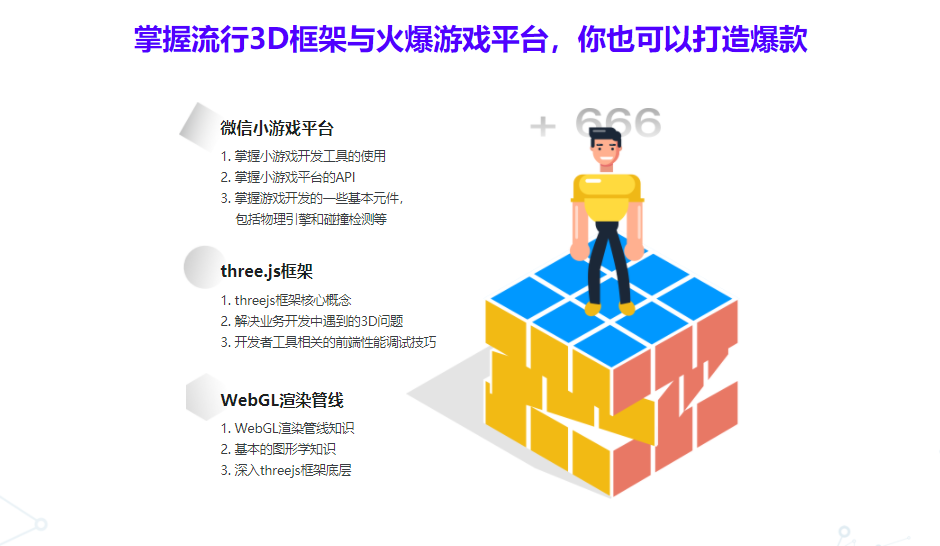 通过使用three.js开发“跳一跳”微信小游戏,以高仿真的实战,带你深入学习微信小游戏API、three.js框架、webgl,让你了解微信小游戏以及移动端的3D Web游戏是如何开发的,掌握这一类移动端3D小游戏的实现和性能优化。