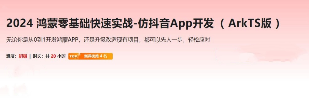 本课程以原生鸿蒙HarmonyOS技术栈为核心,采用最新ArkTS语言开发,并以纯血Harmony API为基础,以超低门槛,带你极速落地HarmonyOS项目–抖音短视频App ,同时掌握最前沿的技术,无论你是从0到1开发鸿蒙APP,还是升级改造现有项目,都可以先人一步,轻松应对!