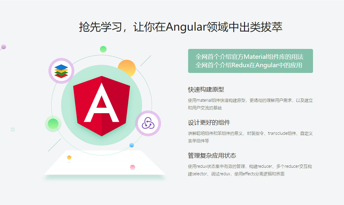 学习 Angular 进阶知识点和技巧(Material、动画、依赖注入、表单控件、RxJS,Redux、自动化测试等),打造一个企业协作平台应用,让你在Angular领域独当一面,具备开发复杂应用的能力。