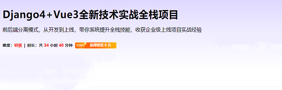 本课程采用全新全栈技术Django4+Vue3,前后端分离开发模式从0到1实战全栈项目,带你系统提升全栈技能、提升把控全局能力与架构设计思维,掌握DRF微服务理念与实战能力,收获企业级上线项目实战经验。