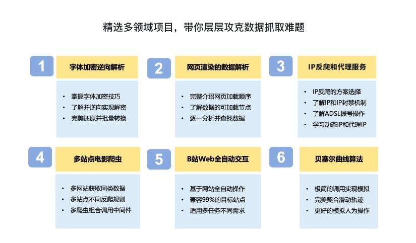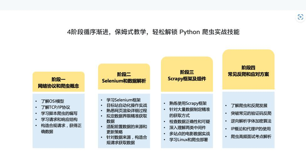 数据时代,越来越多的工作强依赖于数据,而爬虫正是快速获取数据最重要的方式,企业应用中对爬虫相关操作的需求也是越来越多。本课程专为希望系统入门爬虫的同学精心打造,从爬虫基础理论到热门框架应用,从数据解析到常见反爬和应对方案,4阶段带你系统构建爬虫技术体系,精选多领域实战项目,层层深入,带你打牢实用硬技能。