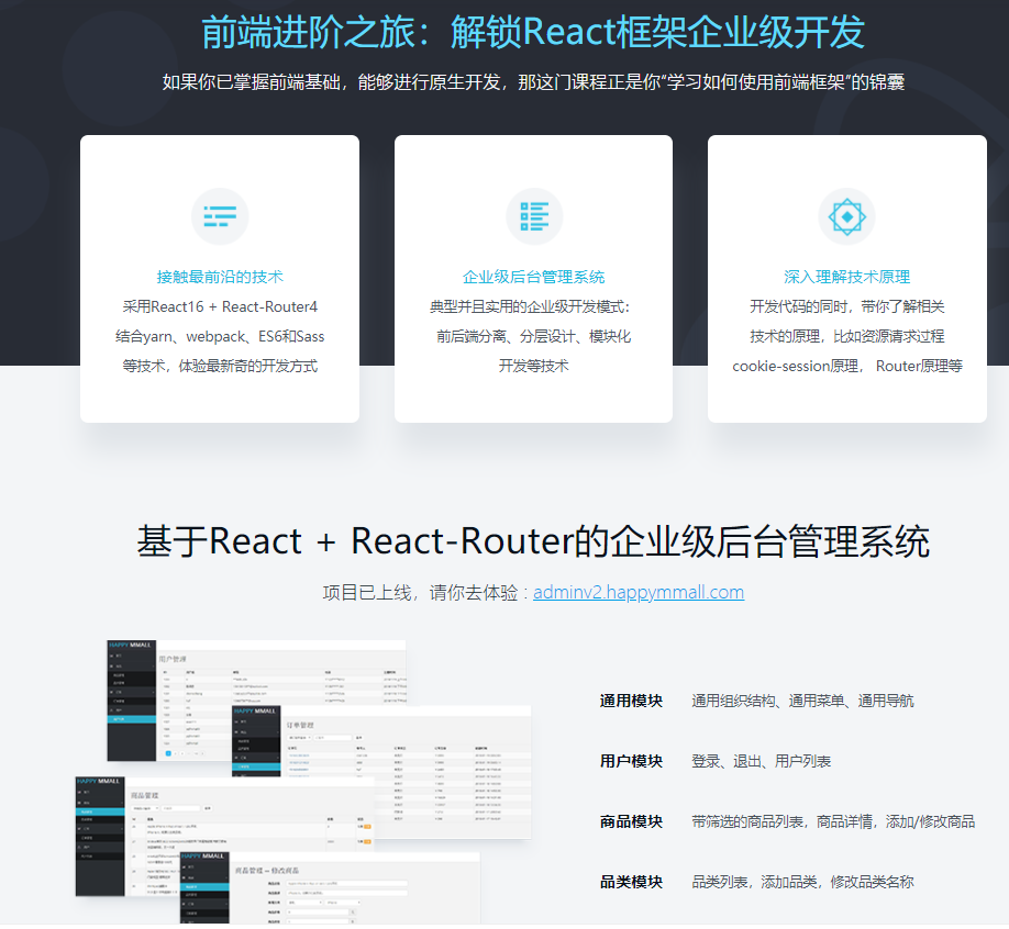 课程针对有一些前端根底,但对前端结构还不够了解,不能灵敏运用的同学,手把手带你用React+React-Router从技能选型开始,直至部署上线,开发一个后台管理体系,让你在实际开发中,打开前端结构的大门,告别小白时代!