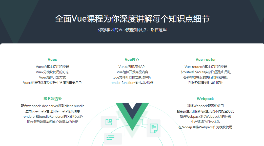 这是一门重技能解说的课程,通过一个Todo使用深化解说Vue使用开发,Vue+Webpack工作流建立,Vue+Vue-Router+Vuex项目架构和Vue服务端渲染深度集成,以此给学员展现Vue使用开发中的各种问题和优质解决方案。