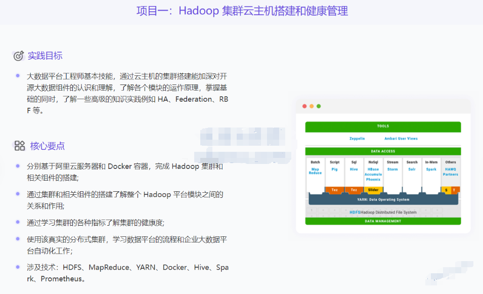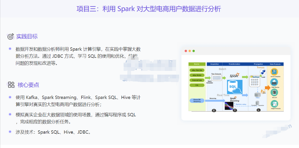 实战项目包含:Hadoop集群和健康管理、搭建数据可视化交互与分析平台、使用Spark对商城平台用户数据分析