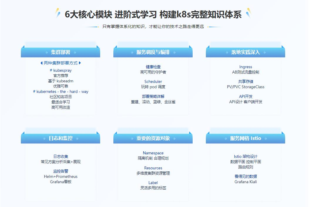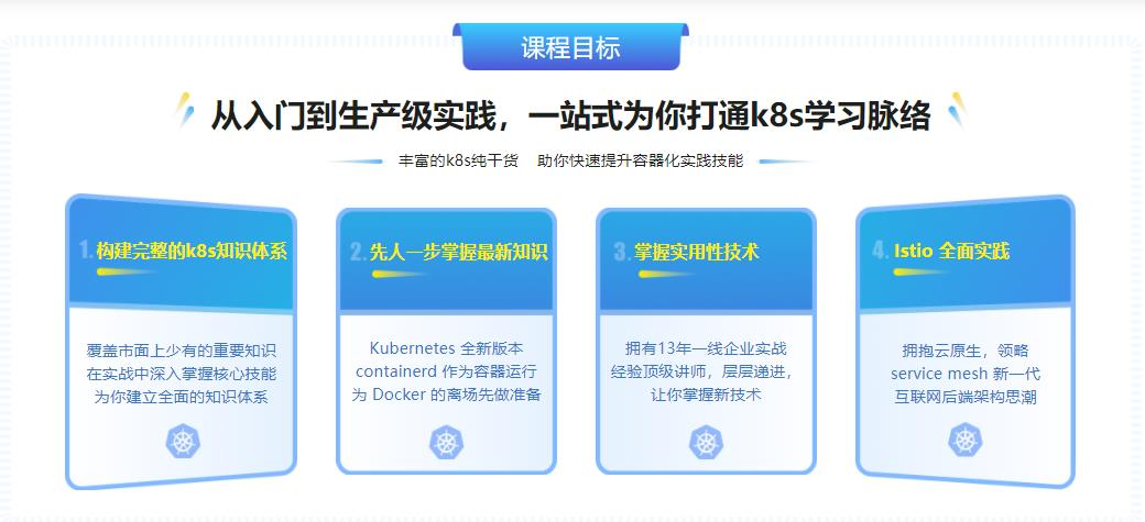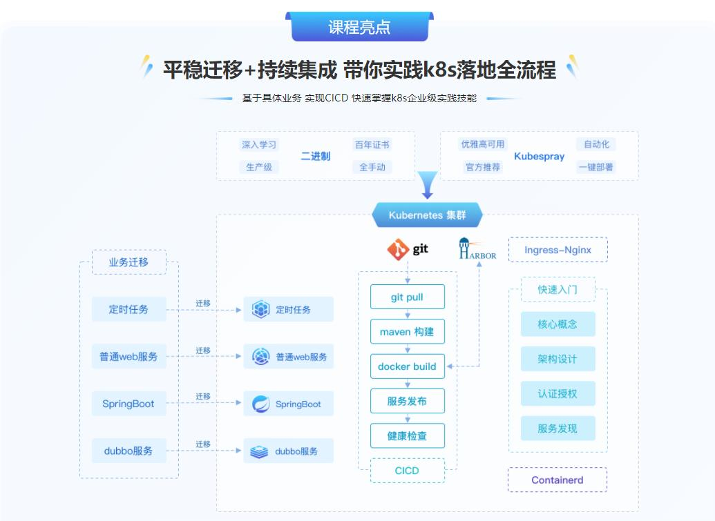 本课程从集群部署到业务迁移、持续集成再到核心知识点梳理,既能快速入门k8s,又能提升k8s生产落地能力,助你少走弯路,避免踩坑。